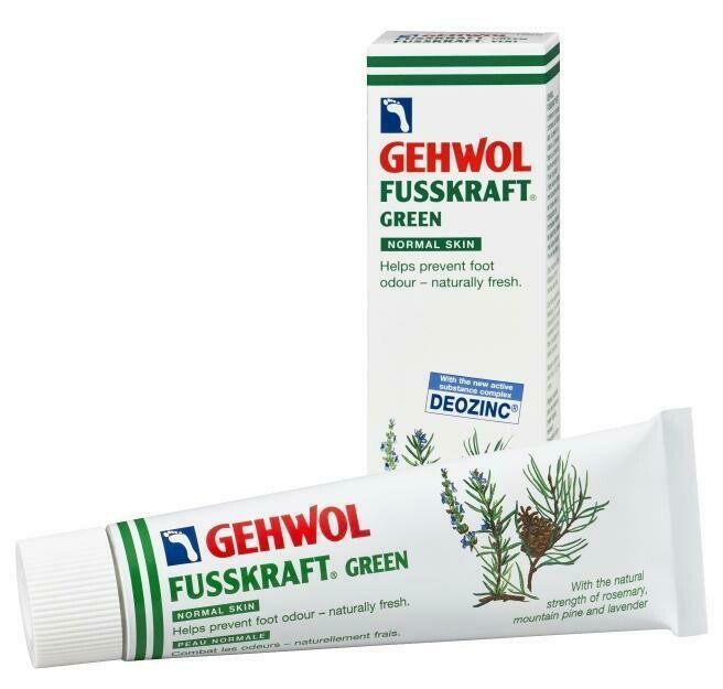 Gehwol Fusskraft Green contains the active substance complex Deozinc in a rapidly absorbed, nourishing cream base for long lasting protection against foot odor. Zinc oxide prevents sweat reduction effectively. Foot perspiration is normalized, the feet become fresh and odorless. Jojoba oil and shea butter smoothen and soften the skin while invigorating camphor and menthol relieve sore, aching feet immediately. The proven disinfecting substance climbazole helps to prevent athletes foot, itching, and blisters.