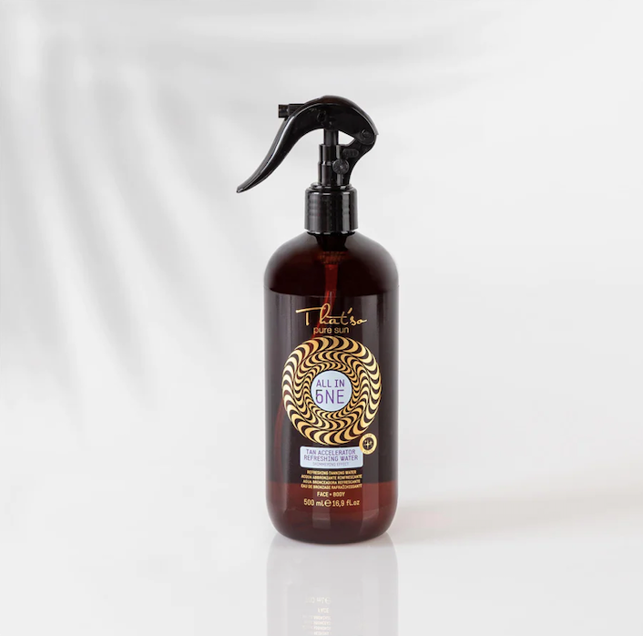 Spray tanning water with GLOW FILTER TECH sparkling effect. The formula contains UNIPERTAN VEG -242, a bio-complex that accelerates the tanning processes. Enriched with Aloe Vera extract useful for skin hydration and Menthol with a refreshing effect.